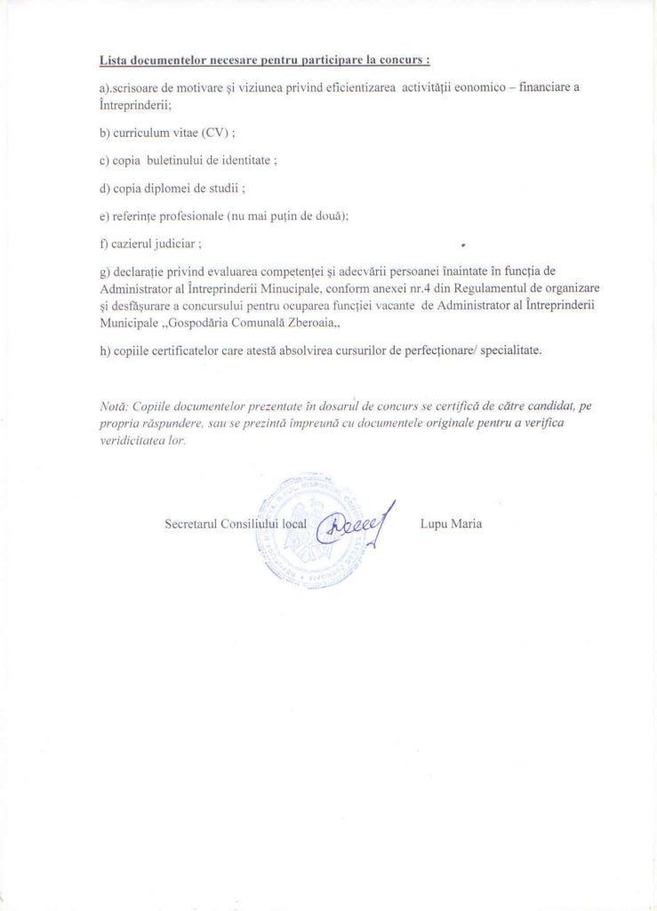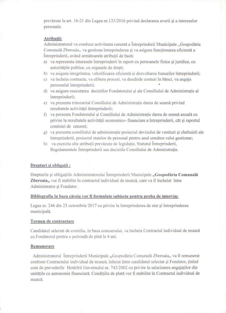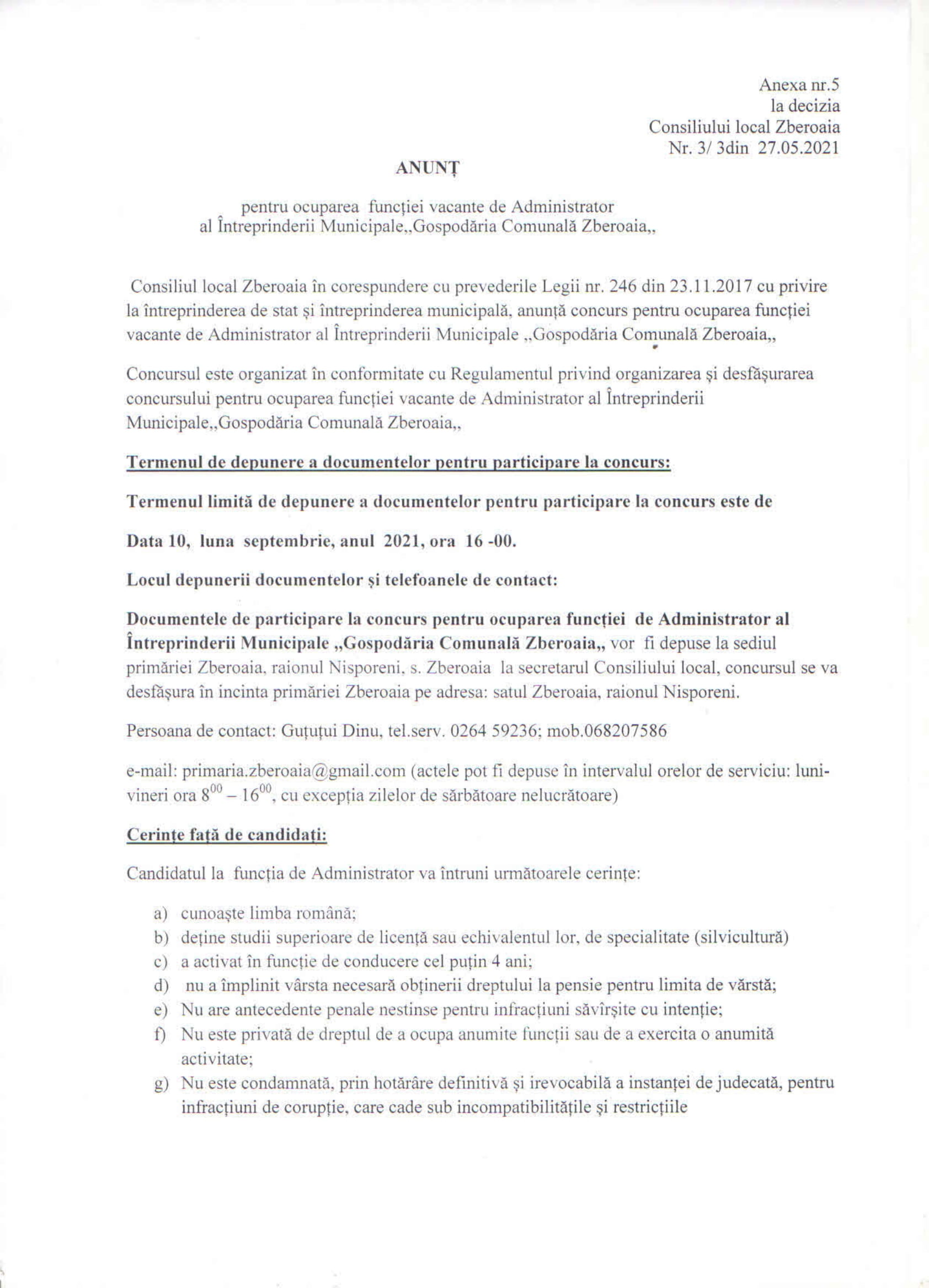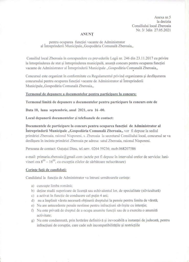 ANUNȚ pentru ocuparea funcției de Administrator al Întreprinderii ”Gospodăria Comunală Zberoaia„