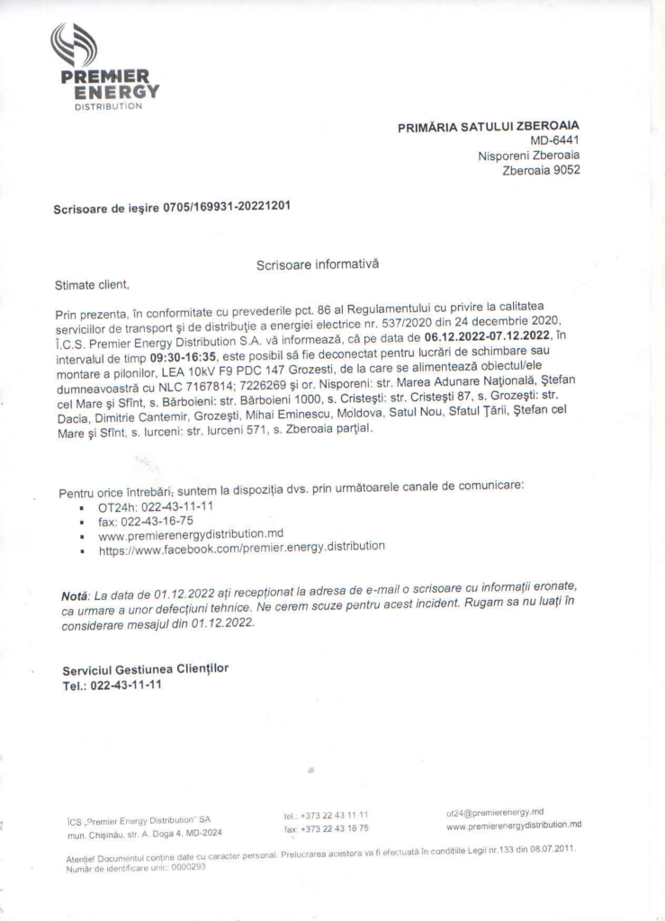 Scrisoare informativă cu privire la deconectări de energie electrică