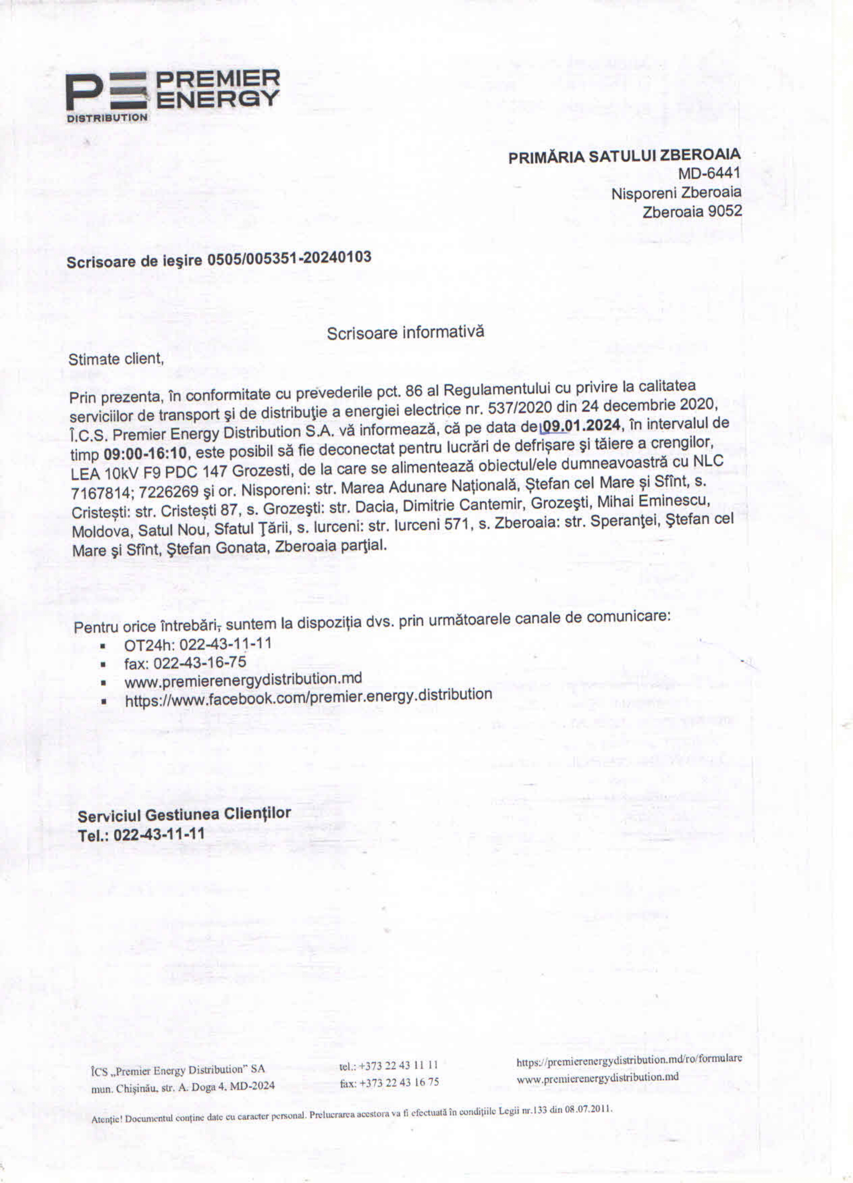 Scrisoare informativă cu privire la deconectarea energiei electrice