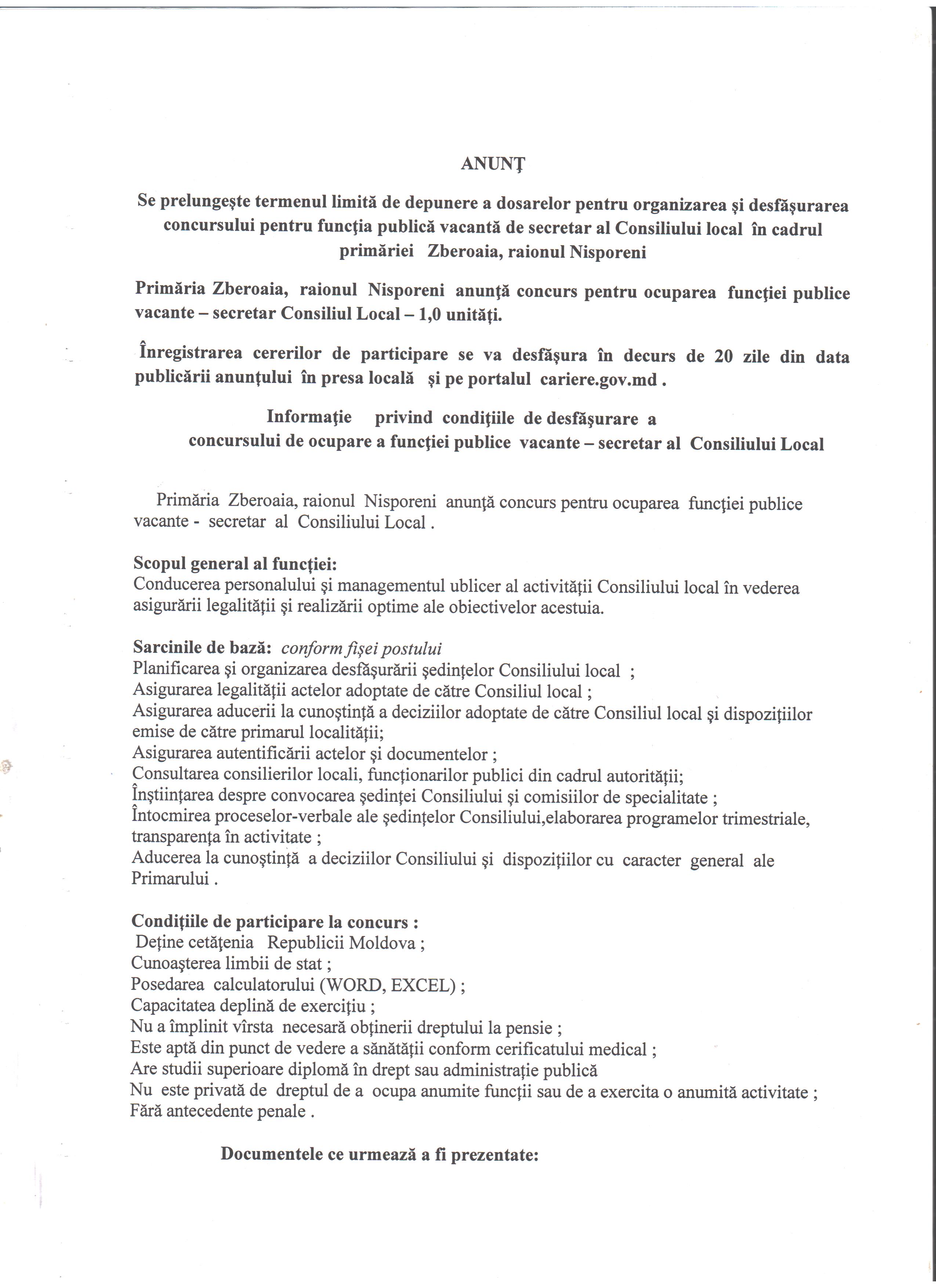Se prelungește termenul limită de depunere a dosarelor pentru organizarea și desfășurarea concursului pentru funcția publică vacantă de secretar al Consiliul local.