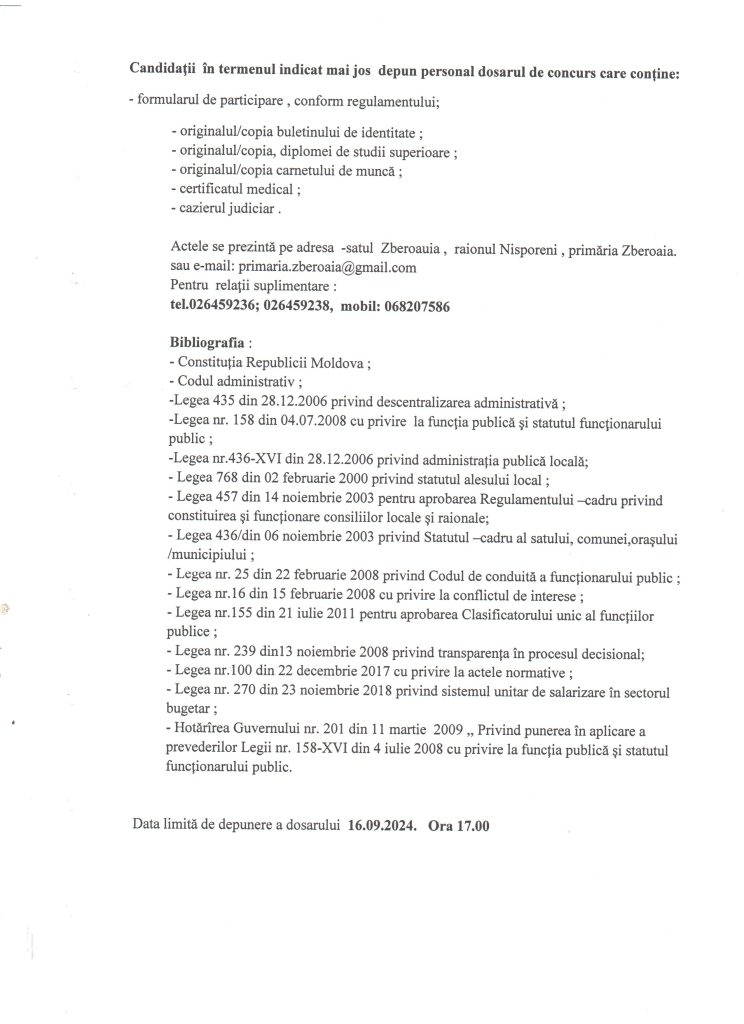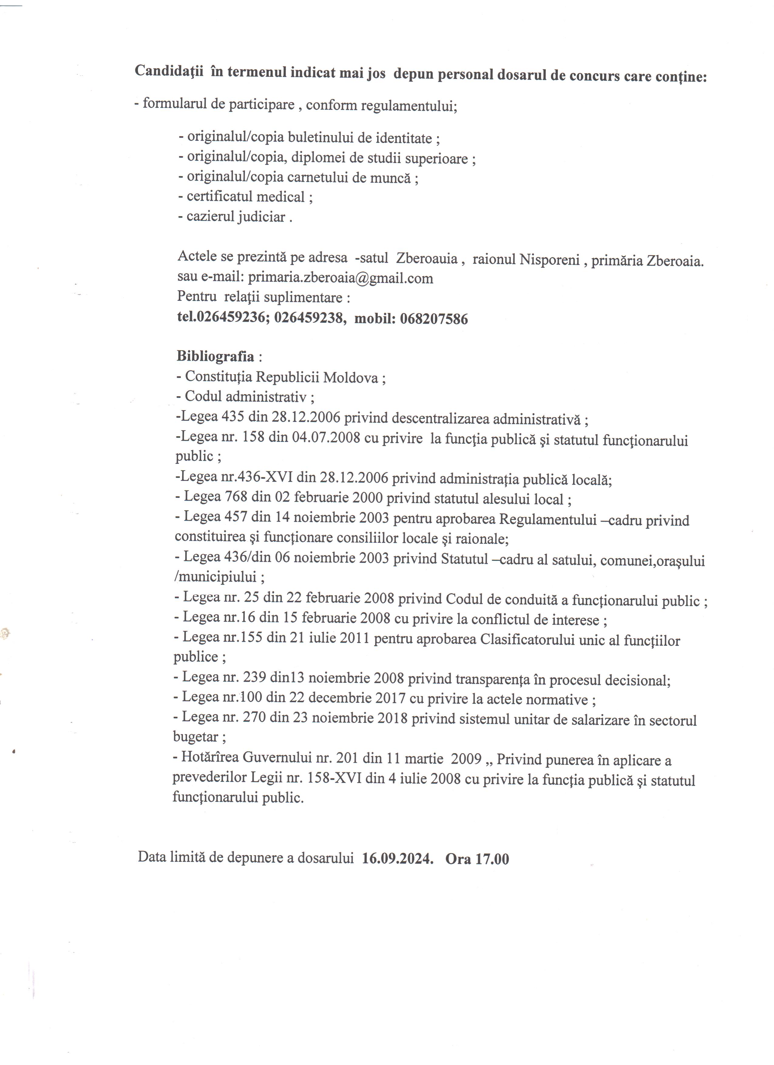 Data limită de depunere a dosarului va fi 16.09.2024,ora 17.00.